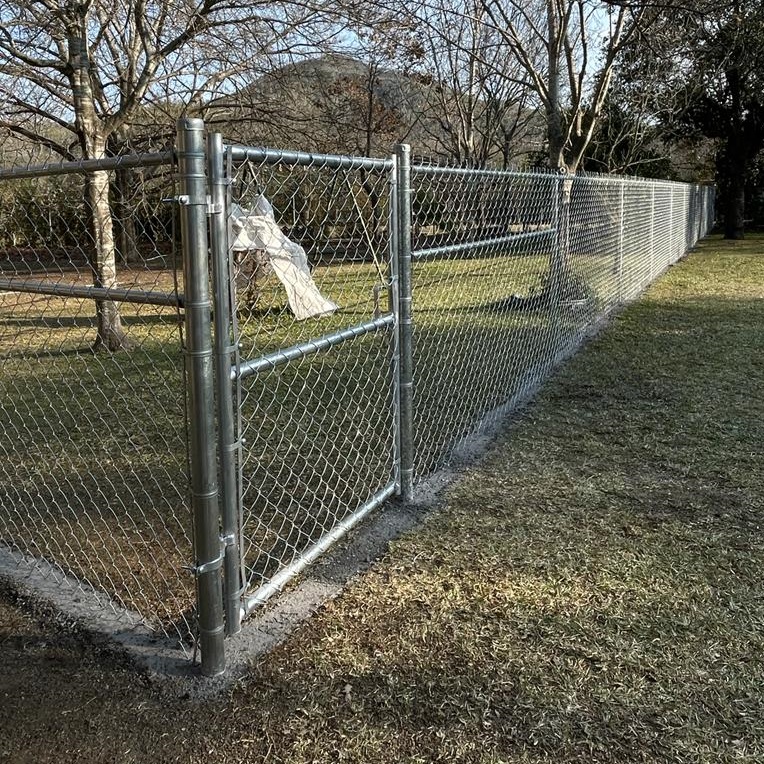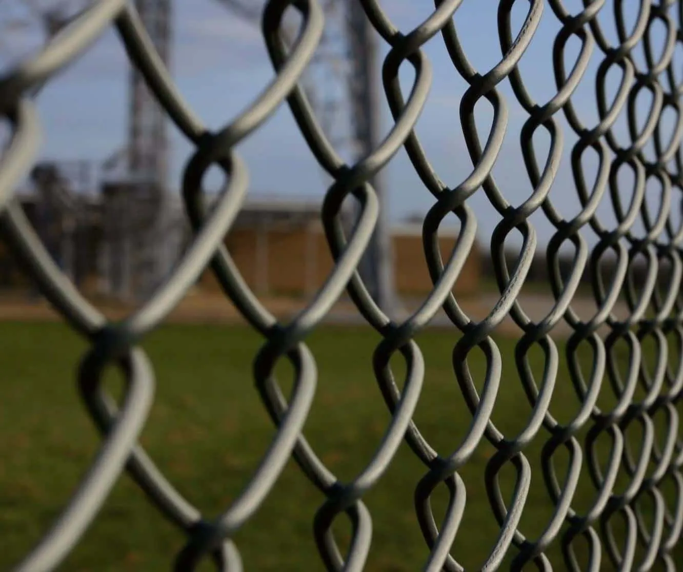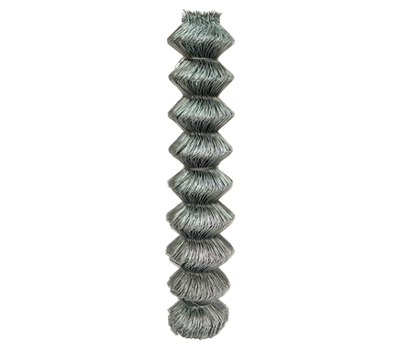 Malla ciclónica fabricada con alambres de acero galvanizado tejida helicoidalmente formando rombos.